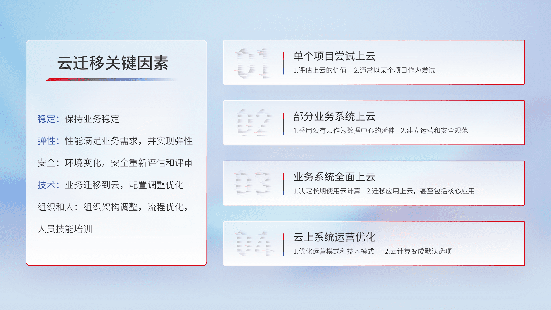 结合实际业务,,,从规划设计、、、云平台选型、、、云原生改造、、、数据迁移、、集成交付,,,,迁移全过程为客户识别最佳上云路径,,,做好风险识别管理,,,,设计网络架构、、身份权限、、、安全审计合规、、、操作审计、、、、日志审计、、、、监控告警策略、、、多站点容灾设计等,,,,对云上基础设施进行整体规划,,,,提升IT治理水平,,,以满足弹性、、、高可用、、、高性能的需求。。